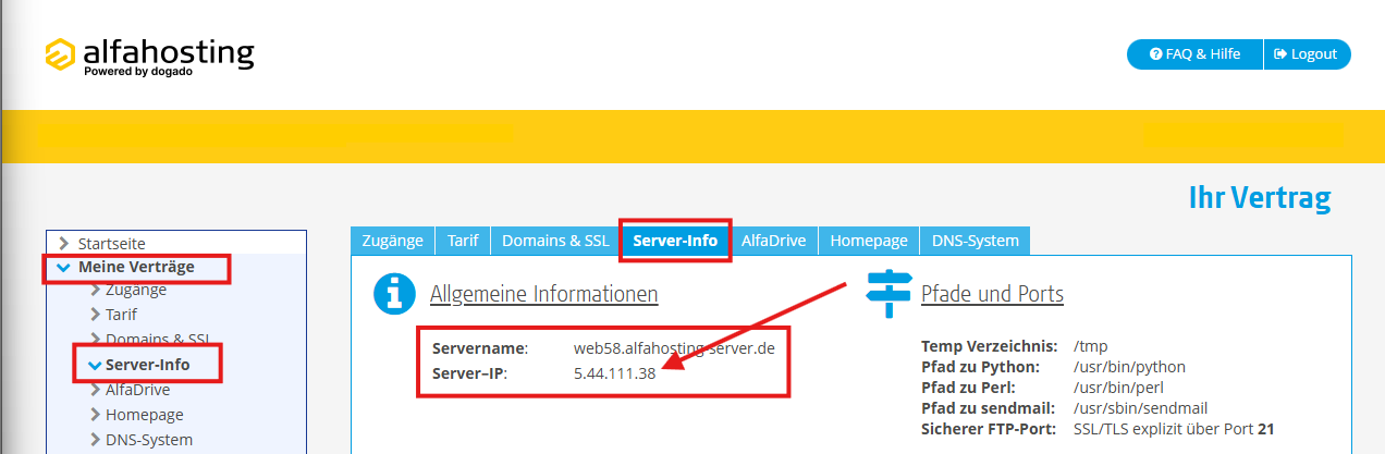 Sie finden die IP-Adresse von dem Server auf dem sich Ihr Account befindet, indem Sie im Kundencenter unter Meine Verträge Ihren Tarif auswählen und zu Server-Info navigieren. Die IP-Adresse finden Sie anschließend unter Allgemeine Informationen > Server-IP.