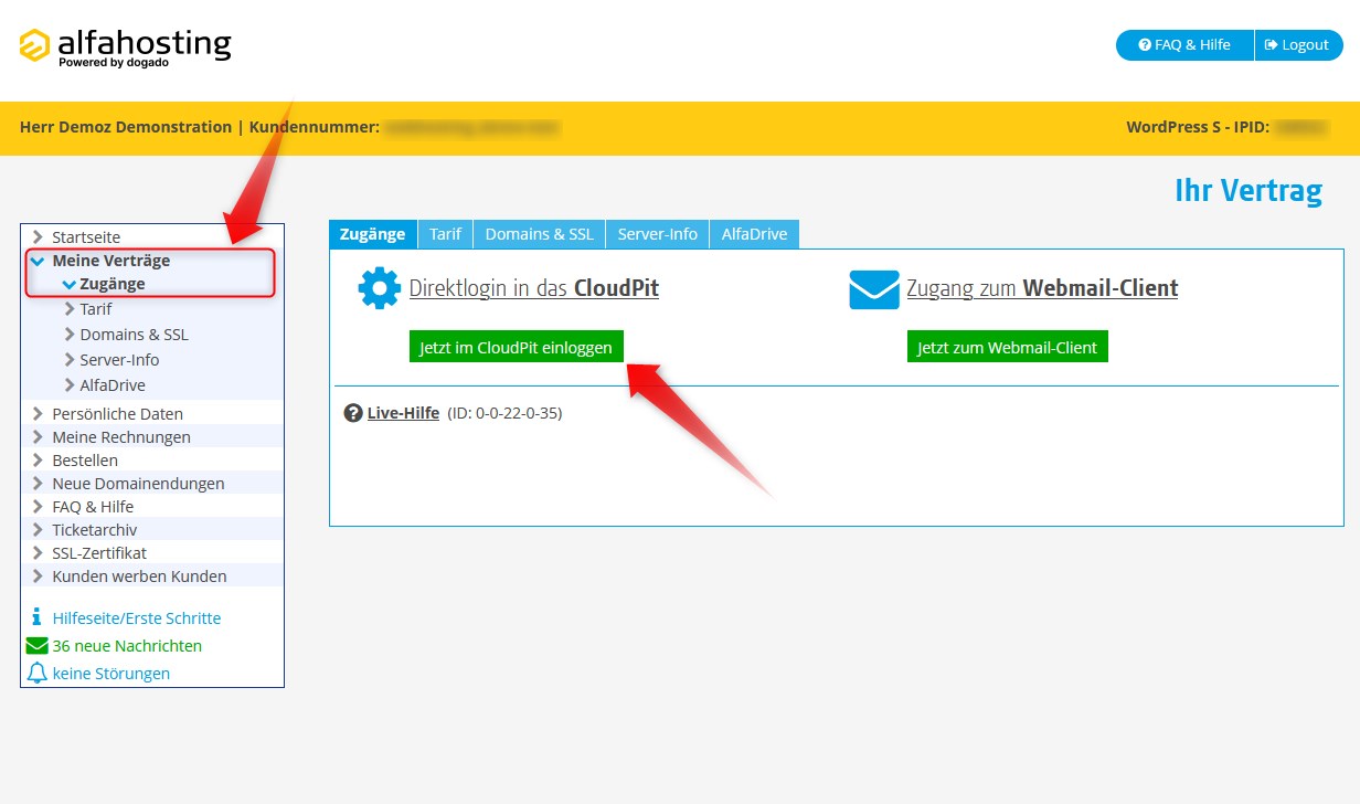 Wenn Sie nun im Kundencenter eingeloggt sind, klicken Sie bitte auf "Meine Verträge" und wählen bitte Ihren Tarif aus, in dem Sie auf die entsprechende "IPID" klicken. Nun sehen Sie zwei grüne Button. Klicken Sie bitte auf den linken Button, mit der Aufschrift "Jetzt im CloudPit einloggen".