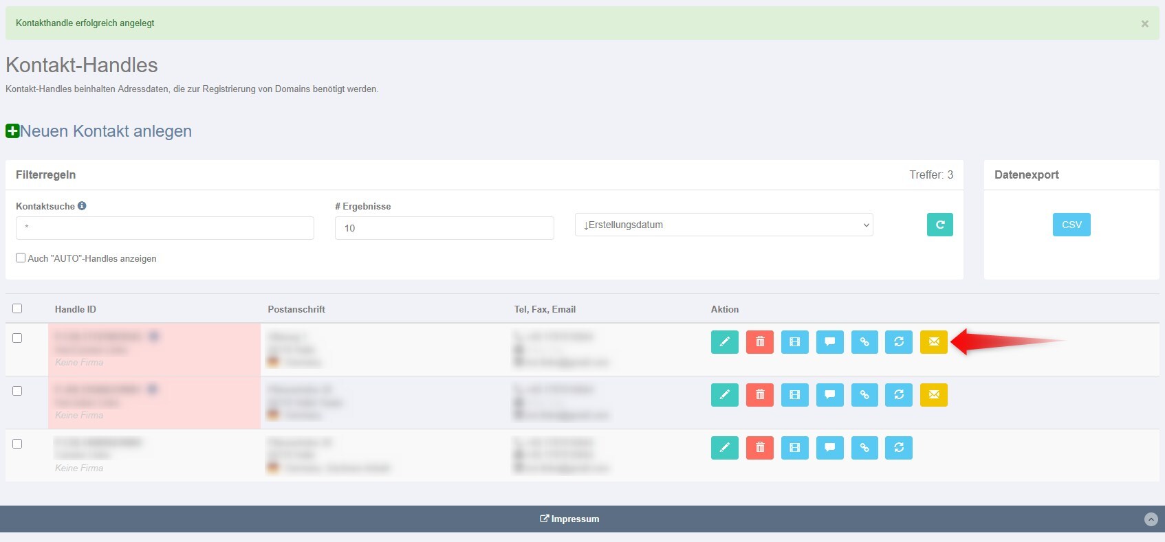 Gehen Sie dazu bitte im Domainrobot auf "Domains" -> "Kontakthandles" und klicken dann bei dem entsprechendem Handle auf das gelbe Icon "Validierungsemail verschicken".